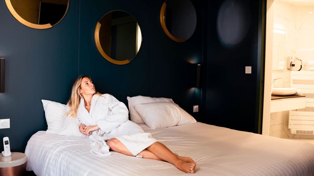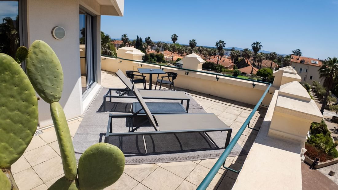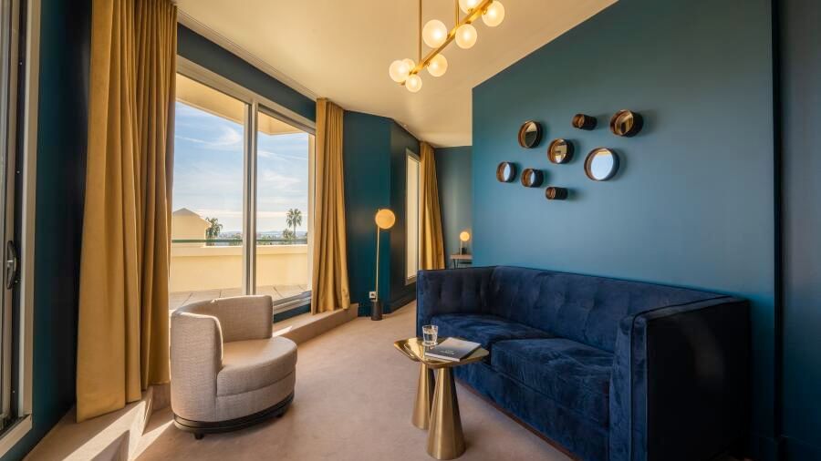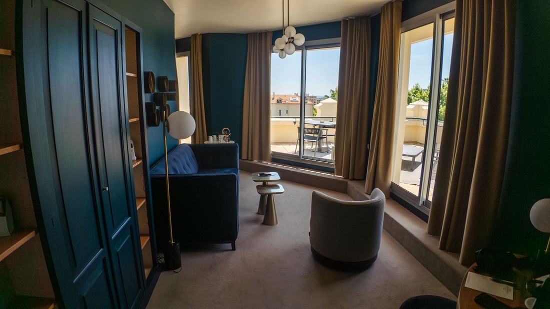 Our hotel in Hyères has 2 Privilege rooms with approximately 41 square metres of floor space. Each has a bedroom area, lounge space and a large outdoor terrace with sun lounger, from where you can see the Mediterranean.